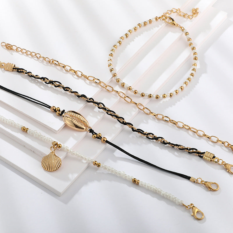 أضف لمسة من beachy style إلى ملابسك مع مجموعة الأساور اليدوية متعددة الطبقات المصنوعة من الأصداف والخرز. تتضمن هذه المجموعة خمسة أساور بأسلوب السلسلة، كل منها مزين بـ cowrie shell pendants و pearl beads، للحصول على مظهر فريد وعصري.
