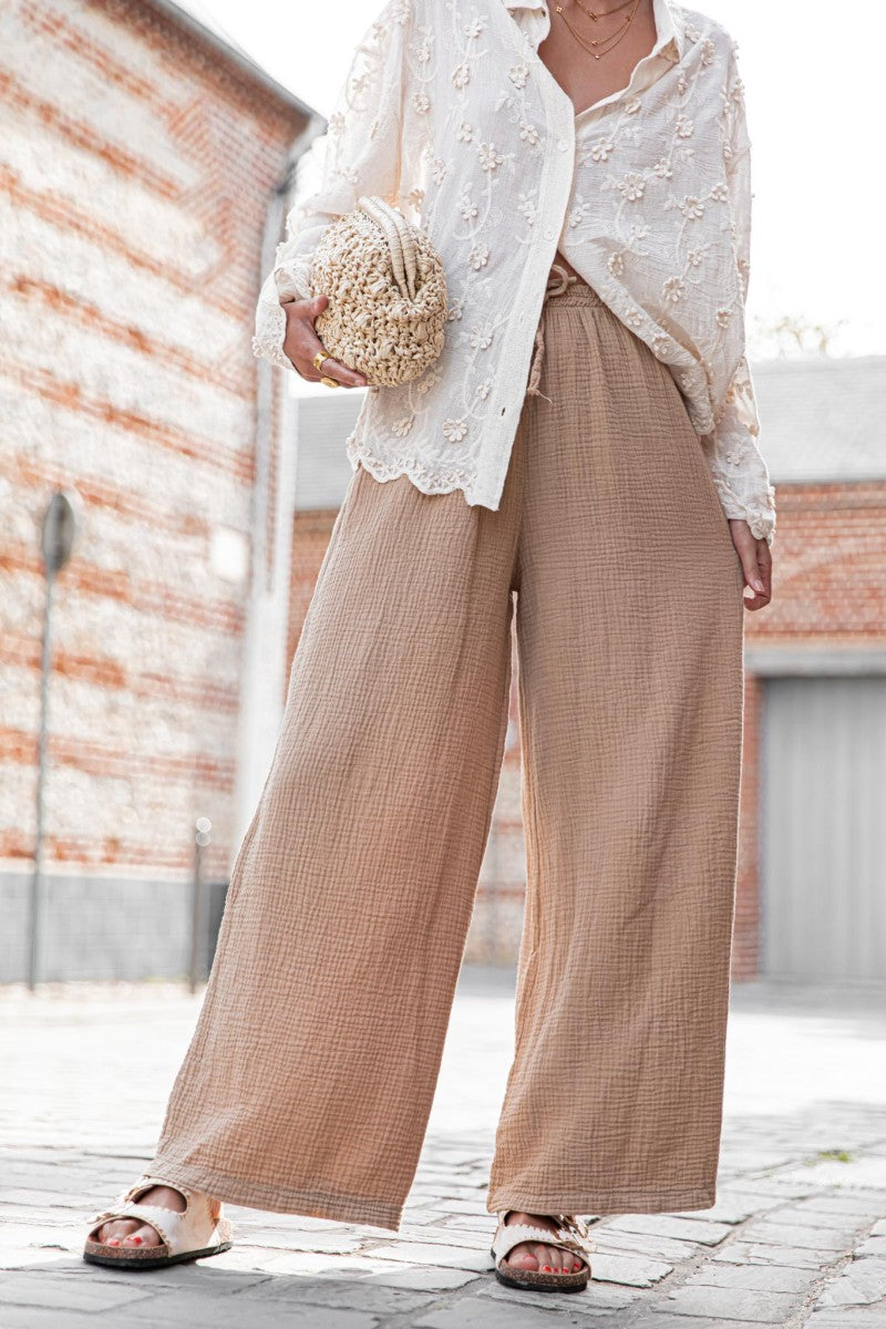 مصنوعة من قماش فاخر، هذه السراويل ذات الساق الواسعة ناعمة وقابلة للتنفس للاستخدام طوال اليوم، بينما يضمن التصميم المريح ملاءمة مريحة.