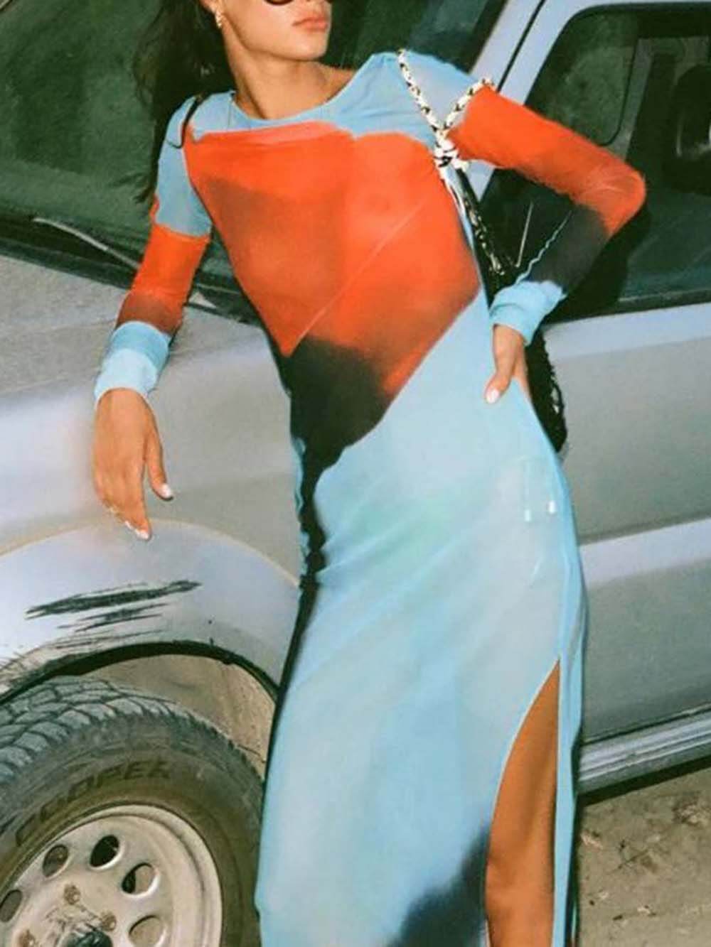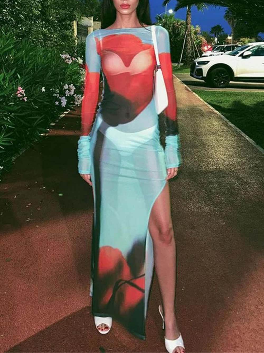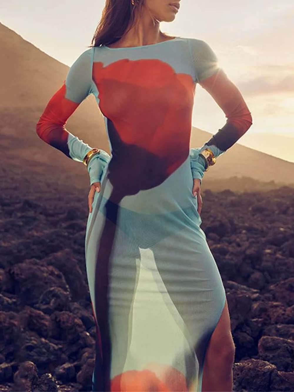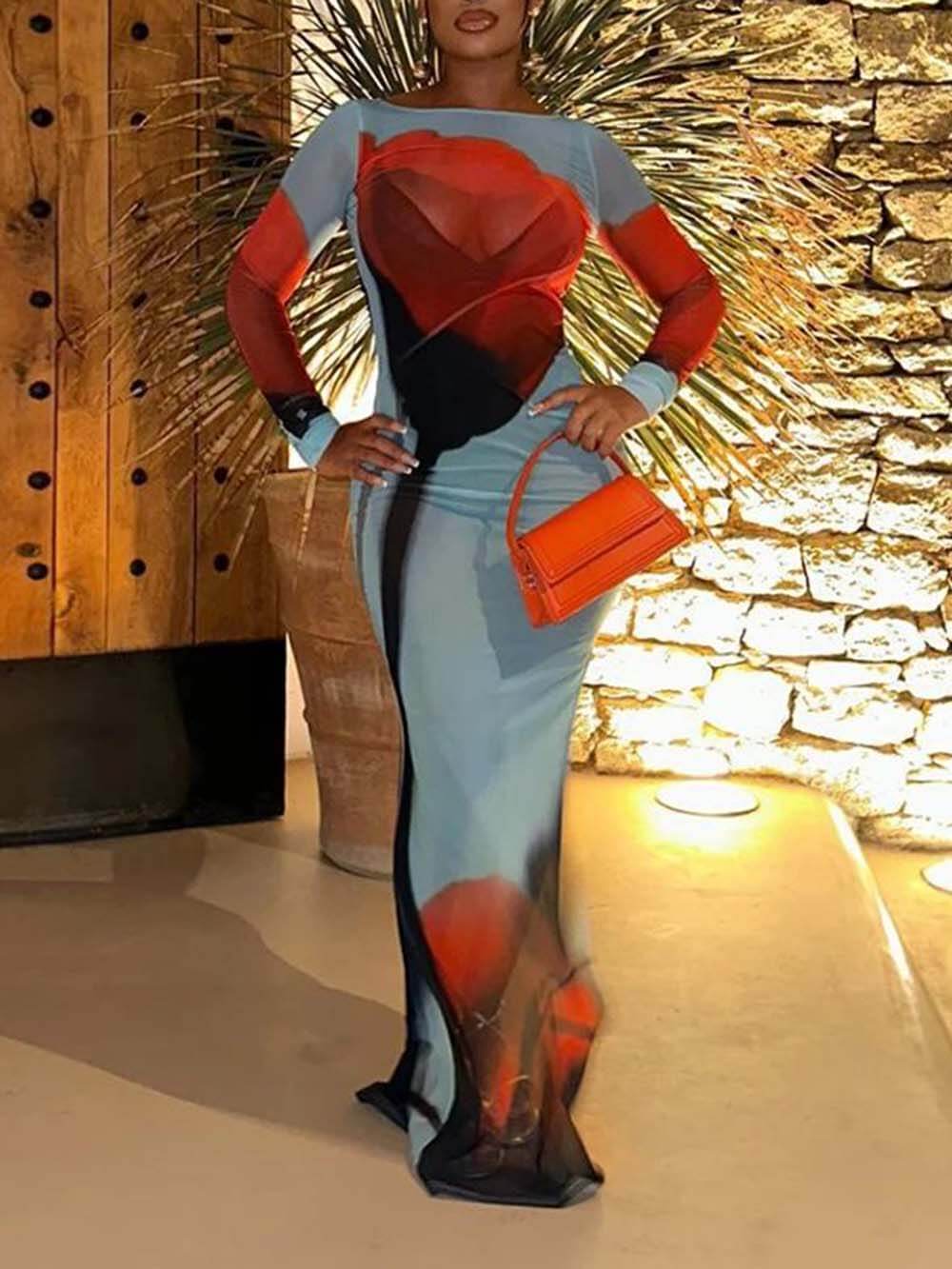 Şık ve rahat giyinmek için Mesh Çiçek Desenli Yuvarlak Yaka Uzun Kollu Esnek Maxi Elbise'mizi giyin.